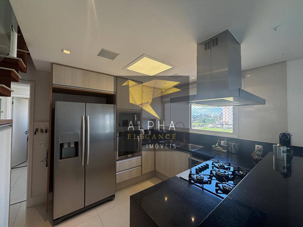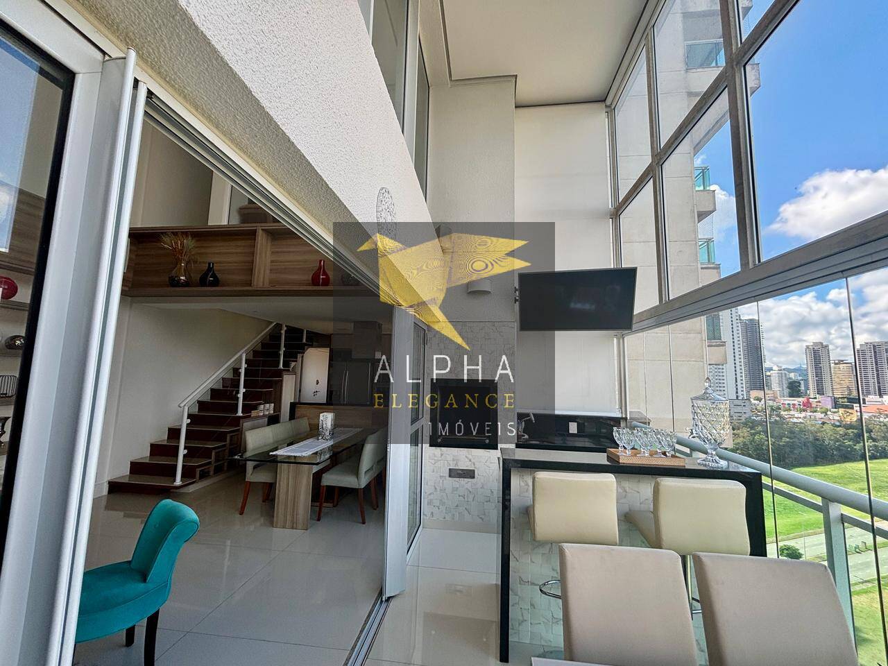 Apartamento de 146 m2, elevador privativo, sala ampla com pé direito duplo, 3 suítes e elevador privativo;- Vista livre e área gourmet contendo churrasqueira a carvão;- Deck na varanda complementar a área gourmet;- Sacada ampla e 100% envidraçada com cortinas automatizadas; - Semi mobiliado (armários, coifa, fogão, forno elétrico, máquina de lavar louça, microondas, etc);